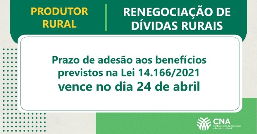 Brasília (25/03/2024) - A Confederação da Agricultura e Pecuária do Brasil (CNA) alerta que, no dia 24 de abril, termina o prazo de adesão às renegociações de dívidas de operações de crédito com recursos dos Fundos Constitucionais de Financiamento do Centro-Oeste (FCO), do Norte (FNO) e do Nordeste (FNE).