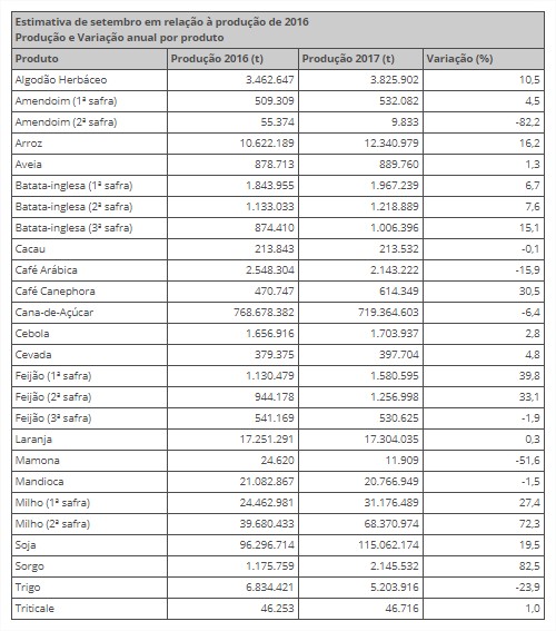 A estimativa de setembro de 2017 para a safra nacional de cereais, leguminosas e oleaginosas foi de 242,0 milhões t, uma alta de 30,3% (equivalente a 56,2 milhões t) em relação a 2016 (185,8 milhões t). A estimativa da área a ser colhida (61,2 milhões ha) cresceu 7,3% frente a 2016 (57,1 milhões ha). As informações são do Levantamento Sistemático da Produção Agrícola (LSPA).