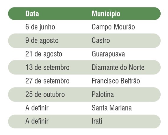 A primeira edição do ano está marcada para 6 de junho, em Campo Mourão, durante o V Fórum do Agronegócio, Tecnologia e Inovação (Fati). O evento será realizado na Associação dos Engenheiros Agrônomos de Campo Mourão (AEACM). As inscrições podem ser feitas até 1º de junho pelo site do Sistema FAEP.