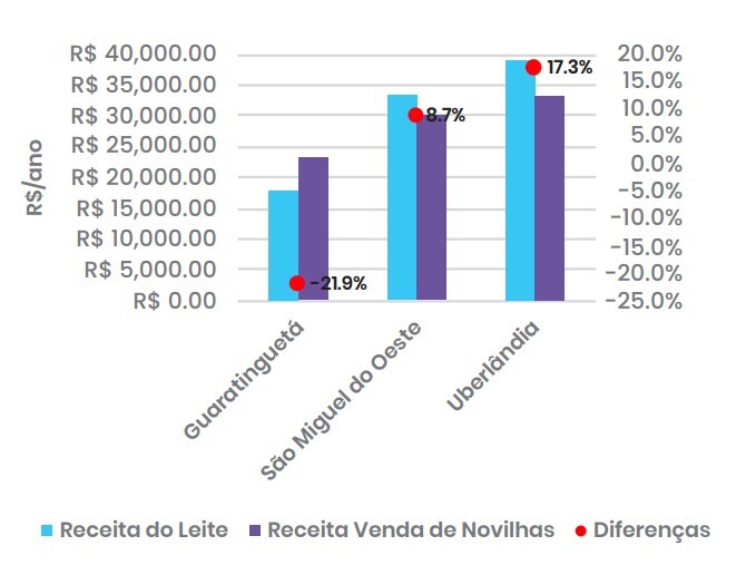 Ao analisar os resultados desta simulação, observou-se que a propriedade de Guaratinguetá/ SP apresentou uma receita com a venda do leite inferior àquela que poderia ser obtida por meio da venda das novilhas excedentes. Em contrapartida, as propriedades das regiões de São Miguel do Oeste/ SC e Uberlândia/MG demonstraram um aumento na receita anual potencial ao priorizar a manutenção das vacas em lactação, evidenciando maior retorno financeiro via a produção de leite em detrimento da venda de animais (Gráfico 1).