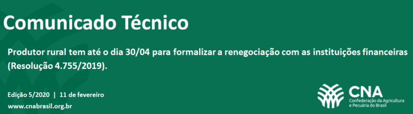 Mais informações sobre as condições para essas renegociações podem ser obtidas na Nota Técnica 46/2019-CNA: https://www.cnabrasil.org.br/artigos-tecnicos/produtor-tem-ate-30-de-abril-de-2020-para-aderir-a-composicao-de-dividas-rurais-autorizada-pelo-ministerio-da-economia-banco-central-resolucao-4-755-2019