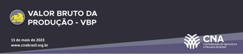 O Valor Bruto da Produção (VBP) da agropecuária em 2023 deve atingir R$ 1,34 trilhão, de acordo com a Confederação da Agricultura e Pecuária do Brasil (CNA). O VBP é o faturamento bruto dentro dos estabelecimentos rurais, considerando as produções agrícolas e pecuárias, com a média de preços recebidos pelos produtores de todo o país.